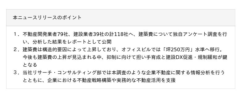 本調査は、株式会社不動産経済研究所(本社:東京都新宿区/代表取締役社長:田村修)と共同で、2025年11月~12月にかけて全国の不動産開発業者79社、建設業者39社の計118社を対象に実施したもので、戦略構築や情報分析を行う当社リサーチ・コンサルティング部が、建築費の実態や今後の傾向、背景要因などを分析しているものです。調査結果の詳細につきましては、以下からご覧いただけます。