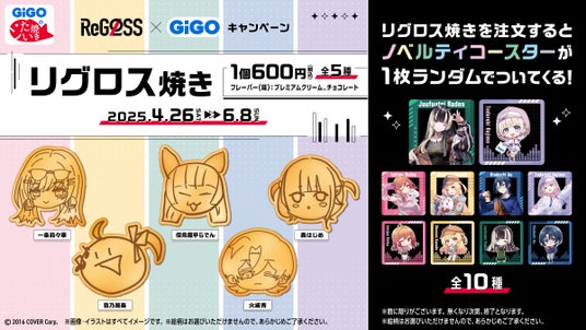 GiGOのたい焼きにて、ReGLOSSメンバー描き下ろしのコラボたい焼き 「リグロス焼き」を販売いたします。1個お求めの方に、オリジナルコースター(全10種/ランダム)を1つプレゼント!
