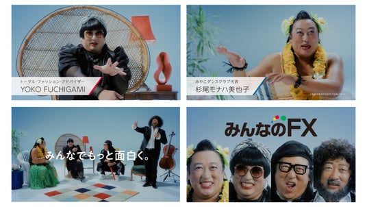 本CMでは、ロバート秋山さんが様々な職業の最前線に立つ人になりきって演じる「クリエイターズ・ファイル」より、トータル・ファッション・アドバイザーのYOKO FUCHIGAMI、プロのTORIMAKIの白木善次郎、みやこダンスクラブ代表の杉尾モナハ美也子、グランデ歌手・世界3大ボイスと称されるジョルナン・ラマの4人を起用。ブランド名に込められた「みんな=あらゆる人にひらかれた投資」をテーマに、CMを制作しました。 それぞれの世界観で大胆かつユーモラスに語られる「みんなのFX」を通して、「FXを身近に感じてほしい」という思いを込めています。