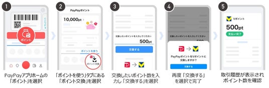 「Vポイント」と「PayPayポイント」の交換は、PayPayアプリをダウンロード(※2)し、「V会員」と「PayPay」のアカウント連携をすることで、ユーザーの保有するポイントを相互交換できます。ポイントの相互交換は、PayPayアプリ内での実施となりますが、モバイルVカード、およびVポイントアプリ、三井住友カードVpassアプリ、VポイントPayアプリ、三井住友銀行アプリからも、ポイント交換の画面を確認できます。