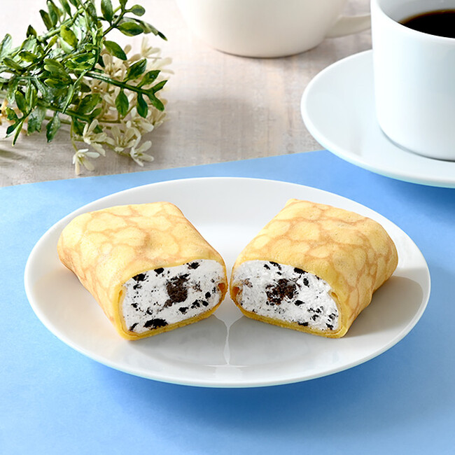 このたび、新フレーバーとして、クランチ入りのバニラホイップクリームとチョコレートコーティングを施したココアクランブルをクレープで包み込んだ「ファミマ・ザ・クレープ クッキー&クリーム」を発売いたします。今回も、「ファミマ・ザ・クレープ」の特長の1つとなっている独特のもちもち食感のクレープ生地をお楽しみいただけるように仕立てました。