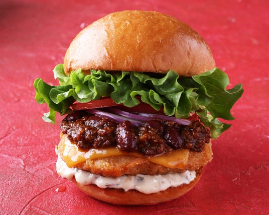 - パン粉とスパイスを使用した特製の衣をつけ、サクッとジューシーに仕上げたフライドチキンに旨みが詰まった「オリジナルチリミートソース」 を合わせた新作『チリチキンバーガー』もおすすめです。