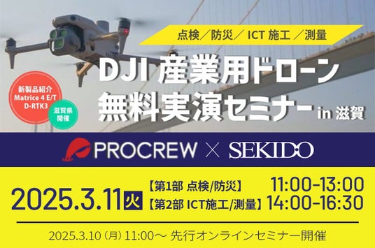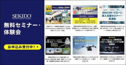 DJI(ディージェイアイ)正規販売代理店としてドローンビジネスの最先端を支える株式会社セキド(本社:東京都港区、代表取締役:大下貴之)は、株式会社プロクルー(本社:滋賀県長浜市、代表取締役:酒井正裕)と共同で3月11日(火)に、高所点検、防災、ICT施工、測量といった業務におけるドローン活用について、デモ飛行や取得データを交えてご紹介する「DJI産業用ドローン 無料実演セミナー」を滋賀県米原市で開催、10日(月)には先行オンラインセミナーを配信いたします。
