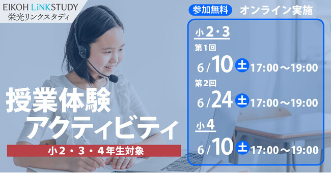 株式会社増進会ホールディングス(Z会グループ)のグループ会社、株式会社栄光(本社:東京都千代田区 代表取締役社長:下田勝昭)が運営するオンライン進学塾「EIKOH LiNKSTUDY(栄光リンクスタディ)」は、中学受験を検討している小学2・3・4年生を対象の「授業体験アクティビティ」を、2023年6月10日(土)と6月24日(土)に開催します。