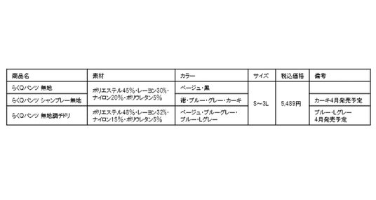 今回、新たに展開する「らくQパンツ」は、加速する服装の自由化に対応可能な、ビジネスでもカジュアルでも着用できる10色の色柄で展開。ビジネスシーンに最適なベーシックな黒・紺に加え、春らしい爽やかさを感じられるブルーやベージュといった明るい色味も数多くご用意しており、シーンやお好み合わせてお選びいただけます。