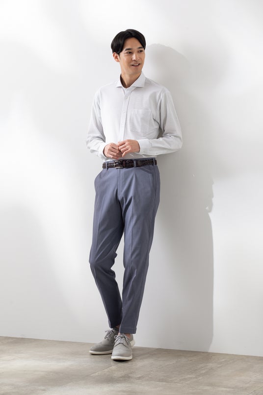 昨今の自転車通勤など、アクティブな動きにも対応可能なウエストシャーリングと身生地全体のダブルストレッチ仕様を採用。加えて、足が綺麗に見えるテーパードシルエットで、すっきりとお召しいただけます。