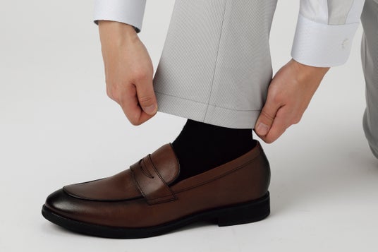 AOKIでは、裾の内側に芯を貼り付けることで約10cmの裾丈調整ができ、スラックスを裾上げせずとも購入後すぐにお召しいただける「らくQパンツ」を発売し、現在までに累計販売点数が15万本を突破するほどご好評をいただいております。本商品は、裾を内側に折り返すとビジネスシーンに最適な「シングル仕上げ」で、外側に折り返すと「ダブル仕上げ」とカジュアルな雰囲気でお召しいただけます。昨今では、コロナ禍を経て自転車通勤される方や、退勤後にジムに通われる方も増加傾向にあるため、パンツ生地はダブルストレッチで、ウエスト箇所はシャーリング仕様と、パンツ全体のストレッチ性を高めました。自転車通勤はもちろん、ウォーキングやゴルフなどアクティブなシーンにも最適なアイテムです。