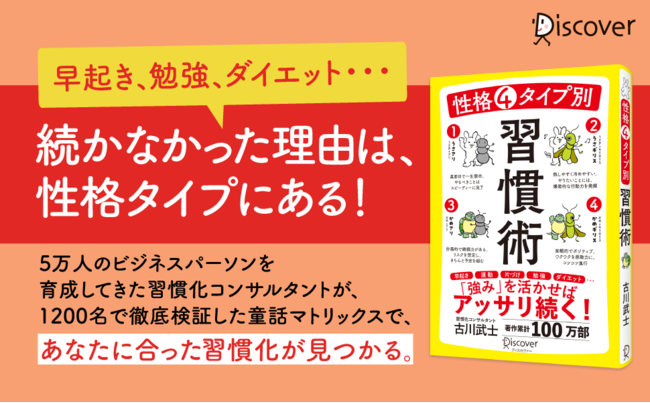 本書では、著者が独自に開発した、習慣化タイプメソッド「童話マトリックス」で、人の行動と動機を4タイプに分類・診断し、それぞれの強みを活かして、弱みをカバーした習慣化のコツを紹介しています。このメソッドは、5万人のビジネスパーソンを育成してきた習慣化コンサルタントである古川武士氏が1200名の協力を得て検証し、習慣化に有効だと結果が出たものです。