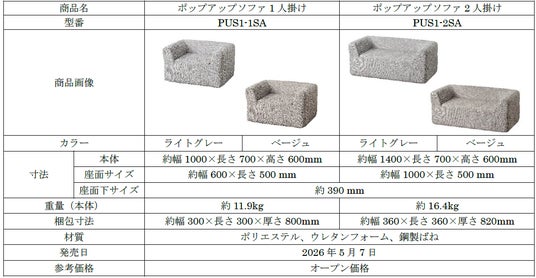 アイリスオーヤマ株式会社(本社:宮城県仙台市、代表取締役社長:大山 晃弘)は、当社のマットレスにおける知見を初めてソファに応用した「ポップアップソファ1人掛け/2人掛け」を2026年5月7日よりインターネットサイトを中心に全国のホームセンターなどで順次発売(※3)します。