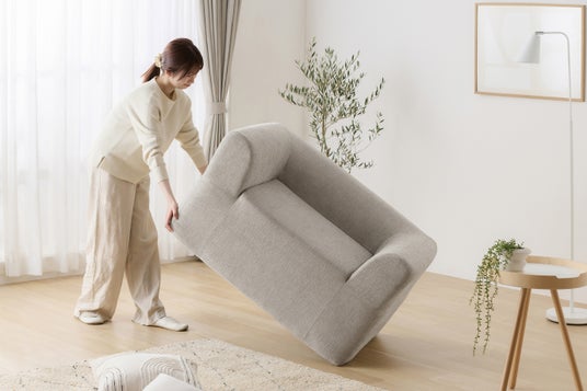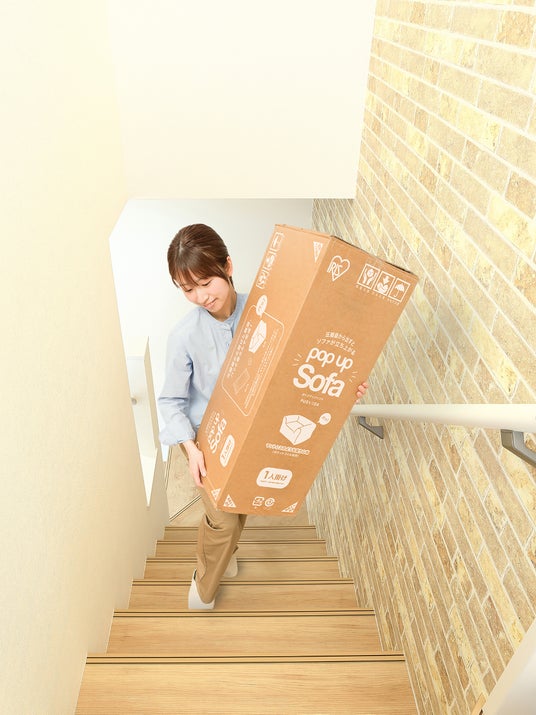 当社のマットレスで培った圧縮梱包技術を初めてソファに応用し、復元時に比べて約1/5(※1)とコンパクトな梱包サイズを実現しました。これにより、玄関や階段、エレベーターなどの搬入経路を通りやすく、2人掛けでも大人1人で持ち運ぶことができるため、搬入時の負担を軽減します。また、圧縮袋から開封後は約10秒(※2)で復元するため、設置したその日から快適に使用できます。