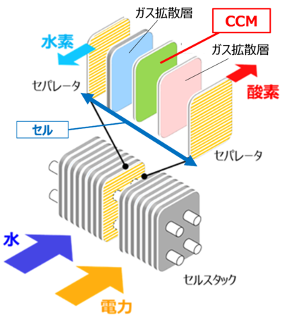 *7:電解効率83%以上(試験条件:60℃、2 A/cm2)*8:数十層の積層でMW級(水素製造量200 Nm3/h級)のセルスタックを製作可能
