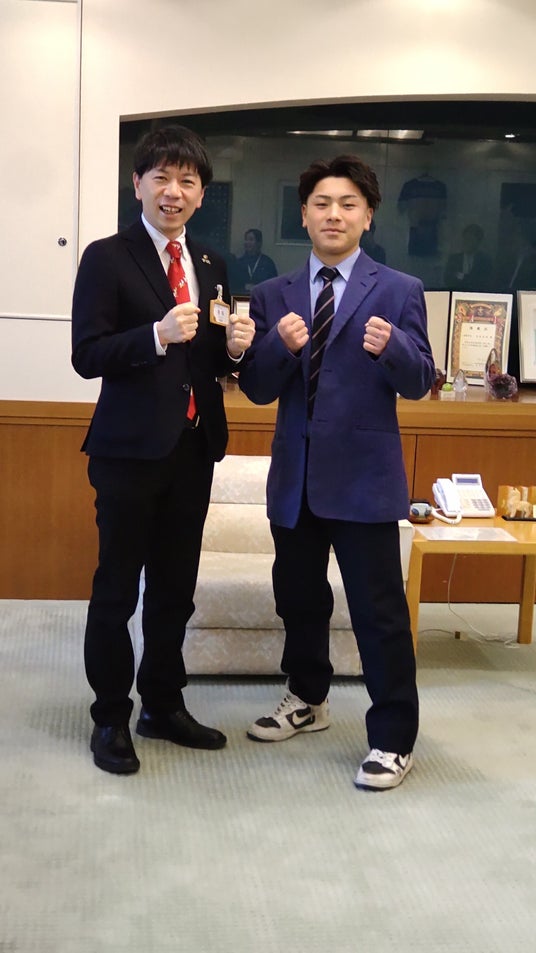 キックボクシング新人王決定戦のチャンピオンに輝き、RISEフライ級(-51.5kg)にランクインも果たした 大久保 祐 選手が、令和8年2月4日に豊橋市役所を訪れ、豊橋市長に結果を報告してくれました。