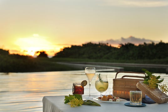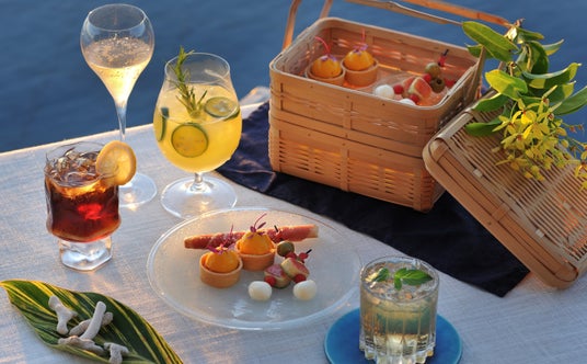 各施設が独創的なテーマで、圧倒的非日常を提供する「星のや」。海に抱かれる沖縄ラグジュアリーの最高峰「星のや沖縄」では、2024年12月1日から2025年2月28日の間、海に沈む夕陽と黄金色に染まる夕焼けの絶景を堪能する「夕凪アペリティフ」を開催します。海に突き出すようにデザインされ、南国らしい植物が育つ星のや沖縄のインフィニティプールで、目の前に広がる夕陽を眺めながら優雅なアペリティフを堪能できるイベントです。サンセットを楽しむ時間のお供には、沖縄生まれのラムやジンで作るカクテルとフィンガーフードを、沖縄で「サギジョーキ」と呼ばれる竹籠で提供するアペリティフセットを用意しました。また、プールは加温式で、冬でも温かく快適に過ごすことができます。温かいプールで沖縄ならではのアペリティフを楽しみながら、海と夕陽が織りなす絶景を眺める至福のひとときを過ごせます。
