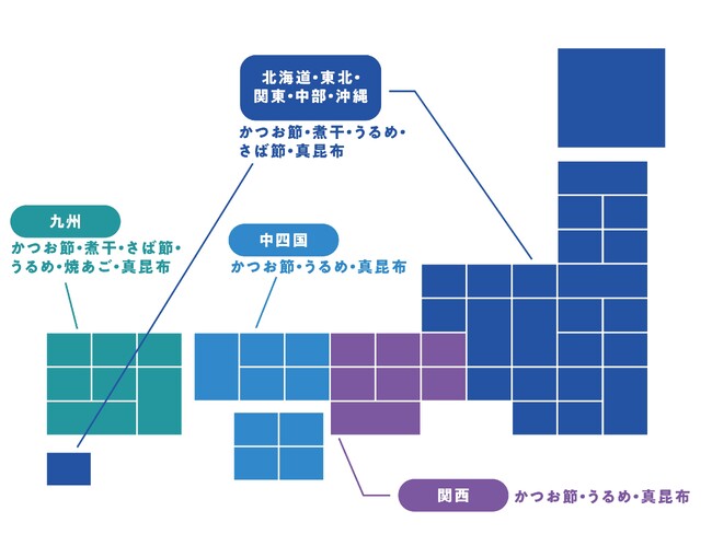 (1) 北海道・東北・関東・中部・沖縄:かつお節・煮干・うるめ・さば節・真昆布