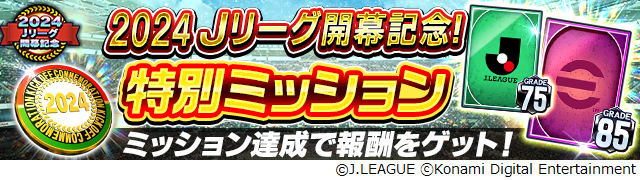 ミッションクリアで「2024Jリーグ開幕記念コイン」や「G85以上ガチャ券」、「お気に入りクラブG75以上ガチャ券」、育成アイテムなどが手に入ります。アイテムをゲットして、チームを強化しましょう!