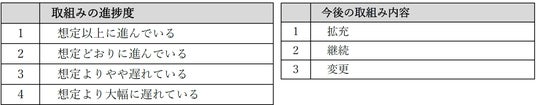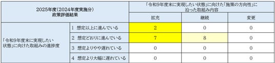 今年度の評価では、16施策とリーディングプロジェクトの計17項目について、「想定以上に進んでおり、取組みを拡充する」とした評価が2施策、「想定どおりに進んでおり、取組みを拡充する」とした評価が7施策、「想定どおりに進んでおり、取組みを継続する」とした評価が8施策となりました。