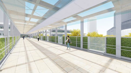 大阪ステーションシティ ノースゲートビルディングの2階西端部(ルクアイーレ西側出口付近)とうめきたグリーンプレイス2階を接続します。JR大阪駅からノースゲートビルディングを経由して、うめきたグリーンプレイス、グラングリーン大阪へアクセスできるようになり、デッキレベルでの回遊性が高まります。来訪者をうめきた2期地区へ誘うゲート空間として、デッキの壁面緑化によるみどり豊かな空間の演出や、うめきた2期地区の眺望を意識した設えとすることにより、来訪者の期待感醸成に寄与してまいります。