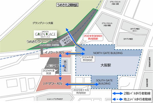 この度、大阪府・大阪市・独立行政法人都市再生機構・三菱地所株式会社を代表企業とするグラングリーン大阪開発事業者JV9社と連携し、うめきた2期地区の先行まちびらき日を2024年9月6日に決定すると共に、既存大阪駅方面(ノースゲートビルディング2階)とうめきたグリーンプレイスを接続する歩行者デッキを同日に開通することとなりましたので、お知らせします。2024年夏に開業を予定しているイノゲート大阪等の開発と合わせ、うめきた2期地区を含む大阪駅西側エリアへのアクセス性は格段に向上し、利便性、回遊性が更に高まります。
