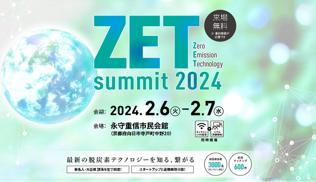 京都府では、ゼロカーボンものづくりによるゼロカーボンまちづくり「ZET-valley」構想の実現に向け、世界各国の脱炭素テクノロジースタートアップや産学公の関係者が一堂に集う国際カンファレンス「ZET(Zero Emission Technology)-summit2024」(https://www.zetsummit-kyoto.com/)を2月6日、7日に向日市で開催します。