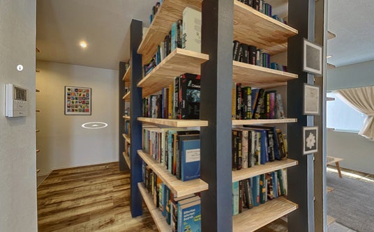 玄関のドアを開けると、目の前に広がるのは天井まで続く本棚。右手の壁一面にも同じく本が並べられた棚が。一歩足を踏み入れ歩みを進める、廊下に沿って続く壁一面の棚。まるで知識と趣味に囲まれたトンネルを抜けるように、進んでいくと、その先には圧巻の光景が広がります。この通路を抜けると、圧倒的な広さを誇る、床から天井までの棚が一面に広がり、本やフィギュア、コレクションが美しく並べられた空間は、まさに自分だけの趣味の世界。