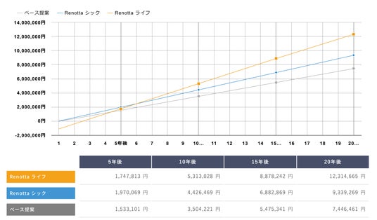 賃貸オーナーの実際の収入となる、税引き後のキャッシュフロー分析でも、一般的な原状回復工事と比較しても4年を過ぎたあたりで収益が逆転し、20年後には約500万の収益差(1.65倍)が出る予測となり、今回のリノベーションが、賃貸経営の収益改善(不動産投資として)に良い効果をもたらすとしています。