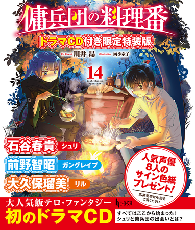 大人気グルメライトノベル『傭兵団の料理番』。4月28日(木)に発売される新刊14巻の限定特装版はシリーズの初ドラマCD付きで販売決定。人気なキャストによるドラマCDでは、豪華なキャストで朱里と傭兵団のメンバーとの出会いをオリジナルシーン込みで完全再現。豪華なキャストの声が聴けるPVも公開中。