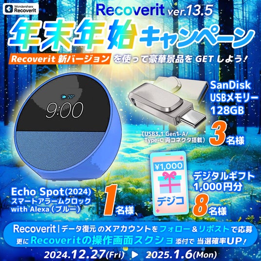 株式会社ワンダーシェアーソフトウェア(東京都港区、代表:呉太兵)のリカバリットver.13.5リリース記念、総勢12名に豪華商品が当たる!