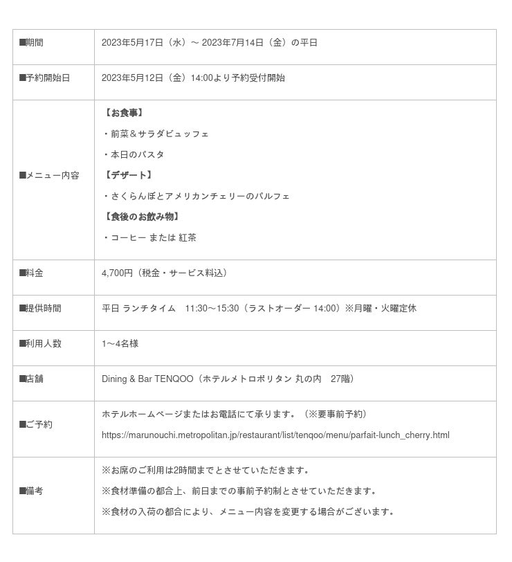 ホテルメトロポリタン 丸の内(所在地/千代田区丸の内、総支配人/蓮見秀樹)のダイニング&バー「テンクウ」では、5月17日より7月14日までの平日、さくらんぼとアメリカンチェリーのパルフェが付いたランチセットを販売いたします。