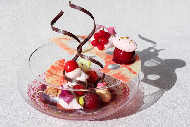 バランスの取れた甘味と酸味が特徴のアメリカンチェリーと、ジューシーで優しい甘味のさくらんぼ、それぞれの果実感を引き立たせるココナッツアイスクリームやさくらんぼムース、ハイビスカスジュレなどで構成しました。