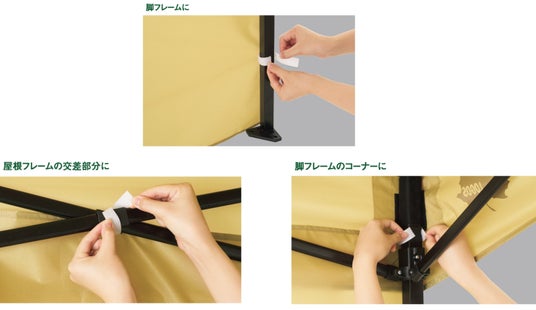 ※タープを使用途中にシートを取り付ける場合は、一度タープの脚フレームを縮め屋根の高さを低くしてから行ってください。※写真はイメージです。※タープによって、ベルクロテープの取り付け位置は異なります。フレームに合わせて取り付けてください。