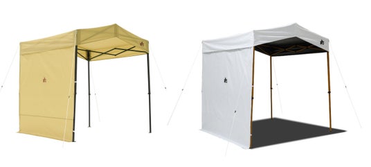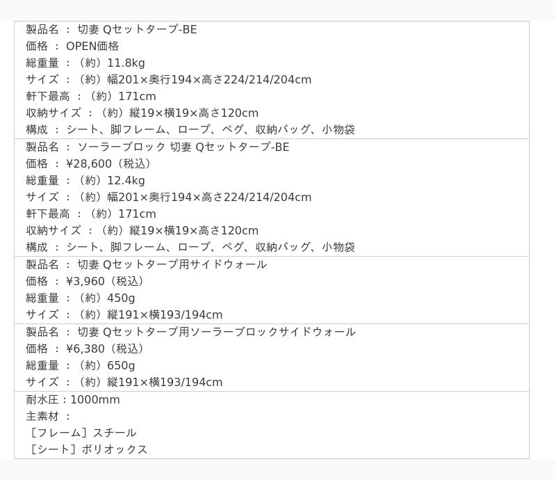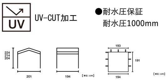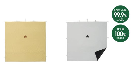 「切妻 Qセットタープ用サイドウォール」の生地は、UVカット加工により紫外線を約90%以上カット。「切妻 Qセットタープ用ソーラーブロックサイドウォール」は、UVカット率99.9%、遮光率100%を誇るソーラーブロック生地を採用し、日射しを遮り熱をやわらげ、夏場でも快適に過ごすことができる。両アイテムともに耐水圧1000mmで、雨の日でも安心して使用可能。