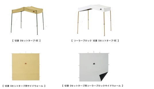 切妻屋根の採用により雨だれを抑え、急な雨や強い日差しにも対応する「切妻 Qセットタープ」2種と、タープに簡単に取り付けや調節ができる「サイドウォール」2種を、キャンプや野外イベントなどのさまざまなアウトドアシーンにてぜひともご活用ください。
