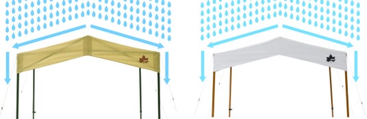 屋根の頭部から、両側に傾斜した形状が特徴の「切妻屋根」を採用。雨天時は雨水が左右へ流れる構造のため、前後の入り口への雨だれを軽減する。出入りする際に濡れにくいので、野外イベントでの受付などの利用もおすすめ。