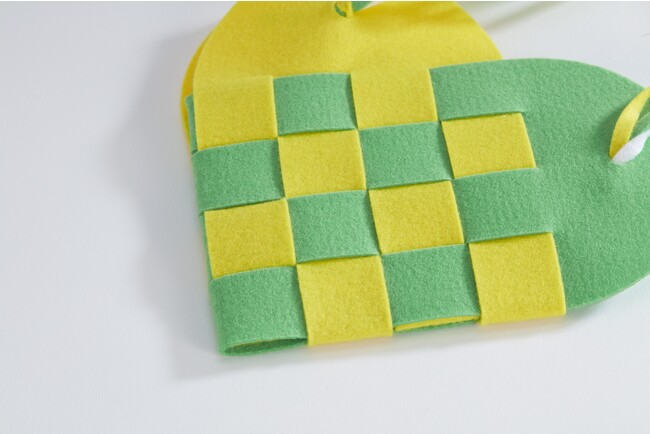 1)2枚のカット済みのフェルトを二つに折り、輪になった切り込み部分を交互に通します。
