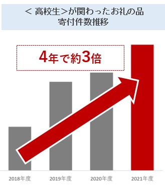 ふるさと納税のお礼の品には、各地の高校生が愛情込めて作り上げた品がたくさんあります。掲載されているお礼の品だけでなく、寄付件数も2018年度~2021年度を比較すると約3倍(287%)と大きく伸長しており、寄付者の「地域で頑張る学生を応援したい」との意識の変化も感じ取ることができます。中には、学校のOBOGが母校で頑張る生徒を応援したいと、寄付する方もいるようです。 生徒たちが、「自分たちによって地域の課題解決や活性化の一助となれないか」という思いが、少しずつ寄付者の意識行動を変化させているのかもしれません。
