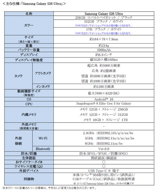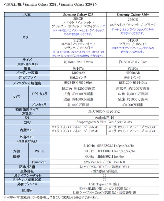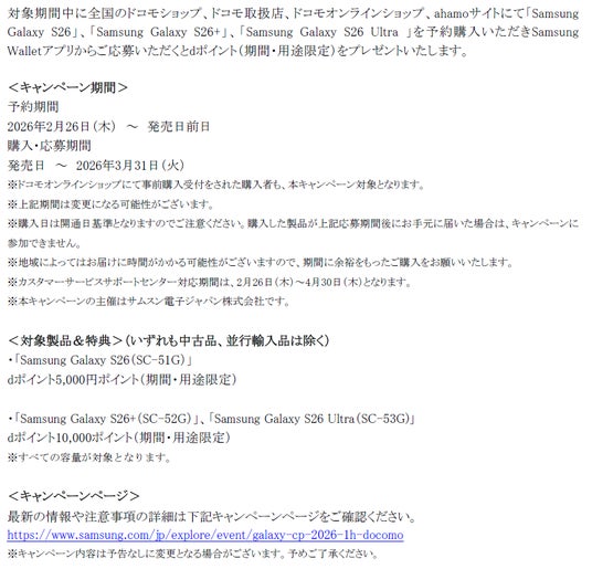 サムスン電子ジャパン株式会社(以下、サムスン)は本日、パワフルなハードウェアと業界をリードするカメラ性能、進化した直感的なGalaxy AI※が日常をかつてないほど快適で簡単にしてくれる先回りするAIフォン「Samsung Galaxy S26」、「Samsung Galaxy S26+」、「Samsung Galaxy S26 Ultra 」(以下、「Samsung Galaxy S26シリーズ」)を株式会社NTTドコモ(以下、ドコモ)で発売を決定いたしましたのでお知らせいたします。「Samsung Galaxy S26シリーズ」は全国のドコモショップ、ドコモ取扱店、ドコモオンラインショップ、ahamoサイトにて2026年2月26日(木)より予約受付を開始し、2026年3月12日(木)より販売開始予定です。