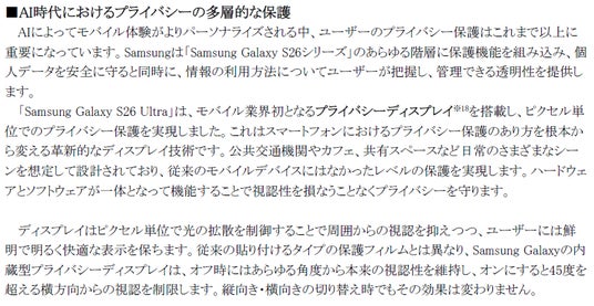 ディスプレイ技術における数十年にわたる革新をもとに、「Samsung Galaxy S26 Ultra」にはモバイル業界初となる内蔵型「プライバシーディスプレイ」を搭載しています。これにより全く新しいディスプレイ体験を提供するとともに、ピクセルレベルでのプライバシー保護というSamsungの確固たるコミットメントを体現しました。さらに「Samsung Galaxy S26 Ultra」にはカスタマイズされたチップセットと刷新された冷却システムを採用しており、最薄な「Ultra」モデルでありながら、より高速かつパワフルなAI処理を実現しました。