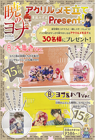 キャラクター大集合ver.とヨナ&ハクver.の全2種類を15名様ずつにプレゼントします。メモやポストカードを挟める、新学期にぴったりなアクリルスタンドをゲットしよう!