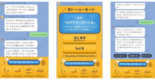 上記サービスを導入し今回提供を開始するけものフレンズの「ジャパリトーク」では、登場する「フレンズ」たちとの賑やかな掛け合いを楽しめます。「日常モード」では、最大3人のフレンズと同時に、今日あったことや、動物たちの生態に関する話題や、お悩み相談といった日常的な会話ができます。会話を続けていると新しいフレンズが出現し、会話の輪に加わります。一方「ストーリーモード」では、けものフレンズが暮らす超巨大総合動物園「ジャパリパーク」を舞台に、ジャパリトークだけのオリジナルストーリーが毎月展開されます。ユーザーはストーリー内で起きる出来事についてフレンズたちとチャットで話し合ったり、ストーリーの流れに合わせて自動で生成される選択肢を選んだりしながら、物語の進行に関わることができ、没入体験を楽しめます。今後はフレンズ・ストーリーの拡充や、会話の質の向上など機能のアップデートを行いながら、より充実したサービスを提供していきます。