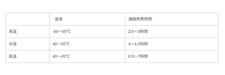 発熱温度:低温 40~45℃(6.5~7時間)、中温 45~55℃(4~4.5時間)、高温 60~65℃(2.5~3時間)
