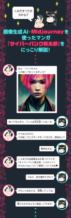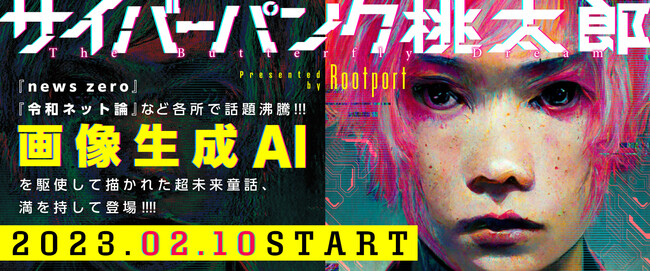 NHK・news zeroほか各種メディアで話題をさらった、AI画像生成ソフト「Midjourney」を駆使して描かれたRootport氏によるフルカラーコミック『サイバーパンク桃太郎』。本作は加筆修正、さらに画像生成AIを使ったマンガの作り方を同著者が解説する10Pの書き下ろしを加えて新潮社バンチコミックスより3月9日に刊行予定ですが、この度、発売に先駆け2月10日(金)より新潮社のWEBマンガサイト・くらげバンチ(https://kuragebunch.com/ )にて掲載を開始いたします。さらに、本作を知らない方向けに「Midjourney」や作品について、ミニキャラたちが簡単に解説する「にっこり解説」をブログにて公開予定です。