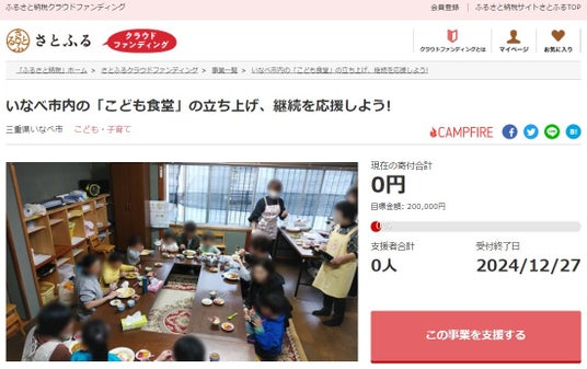 三重県いなべ市とふるさと納税ポータルサイト「さとふる」を運営する株式会社さとふる(本社:東京都中央区、代表取締役社長 兼 CEO:藤井 宏明)は、「さとふるクラウドファンディング」にて、「いなべ市内の『こども食堂』の立ち上げ、継続を応援しよう!」の寄付受け付けを2024年10月7日より開始します。