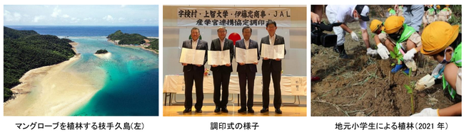 宇検村は、子どもたちのふるさとの自然への誇りを育む取り組みとして、2014年から地元の小学生によるマングローブ植林活動を行ってきました。伊藤忠商事はその趣旨に賛同し、生物多様性の保全や、ブルーカーボン・クレジットの創出も視野に2021年より植林活動を支援しています。また上智大学とJALについては、2022年より共同で環境保全と観光促進の両立で地域活性化を図るモデル(奄美モデル)の構築を宇検村にて行い、シンポジウム等で取り組みを発信しております(*1、*2)。