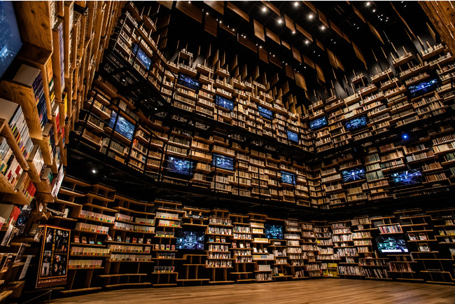 館内には、高さ8mの巨大本棚が360度取り囲む「本棚劇場」や、ライトノベルなど世界でもっとも