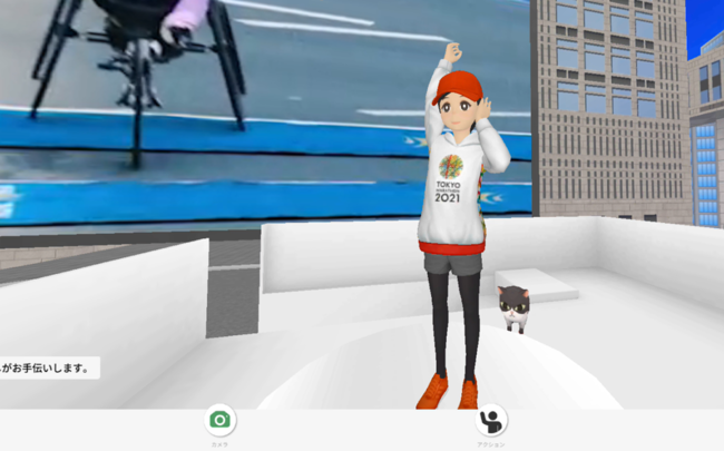 都庁前にあるスタート台で、アバターのエモート機能によってスターター体験が可能。通常、大会会長が行う「号砲の合図」を自分のアバターで体験できます。更に、スタートの合図に合わせて、紙吹雪が舞い、ランナー姿のアバターが走り出すなど、実際のマラソンスタートの演出と同じような体験を通して、マラソン大会を盛り上げます。