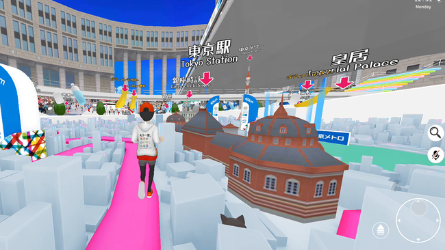 実際の東京マラソンのコース周辺を3Dモデル化。スタートの都庁前から、フィニッシュの東京駅前・行幸通りまでのコース全体やコース上にある給水・給食ポイントなど、実際のコースを再現しています。アバターを介してコースの下見や疑似マラソン体験が楽しめます。