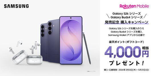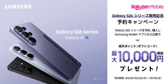 サムスン電子ジャパン株式会社(以下、サムスン)は本日、パワフルなハードウェアと業界をリードするカメラ性能、進化した直感的なGalaxy AI※が日常をかつてないほど快適で簡単にしてくれる先回りするAIフォン「Samsung Galaxy S26」、「Samsung Galaxy S26+」※2、「Samsung Galaxy S26 Ultra」※2(以下、「Samsung Galaxy S26シリーズ」)を楽天モバイル株式会社(以下、楽天モバイル)で発売を決定いたしましたのでお知らせいたします。「Samsung Galaxy S26シリーズ」は、楽天モバイル公式サイトにて2026年2月26日(木)より、楽天モバイル公式 楽天市場店にて2026年3月2日(月)より予約受付を開始し、2026年3月12日(木)より楽天モバイル公式サイト、楽天モバイル公式 楽天市場店、楽天モバイルショップにて販売を開始いたします。