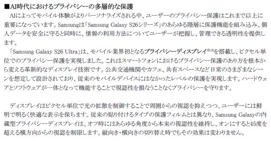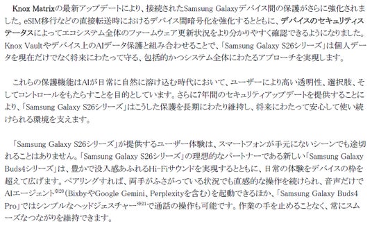こうした卓越した技術の融合により、「Samsung Galaxy S26シリーズ」はかつてないほど快適でパワフルなSamsung Galaxy体験を提供します。