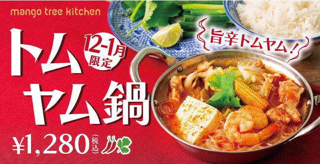 アークランドサービスホールディングス株式会社の子会社、海外の本場の味を日本で展開する株式会社ミールワークス(本社:東京都千代田区、代表取締役社長:小島 由夫)は、タイ・バンコクに本店をもつ「マンゴツリー」の姉妹店で本格タイ料理をファストフードのようにカジュアルに楽しめるイートイン&テイクアウト「マンゴツリーキッチン」で、2023年12月1日(金)から1月31日(水)まで、寒い冬にぴったりの「トムヤム鍋」を販売いたします。