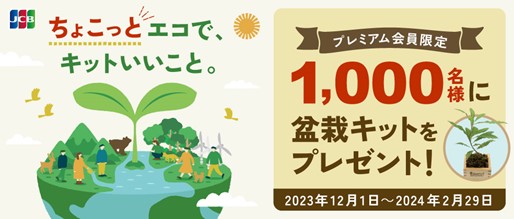 株式会社ジェーシービー (本社:東京都港区、代表取締役兼執行役員社長:二重 孝好、以下:JCB)は、持続可能な社会の実現に貢献するため、カーボンニュートラルに向けた取り組みを強化しています。このたび、会員様と一緒に取り組める活動のご紹介と共に、プレミアム会員様限定でCO2 を吸収してくれる盆栽キットをプレゼントする企画を実施いたします。